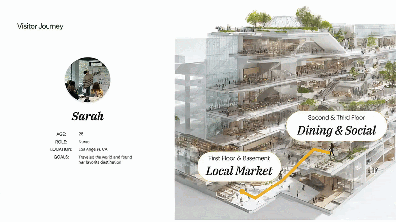 The service structure is designed to encourage cross-floor engagement — visitors move naturally from one experience to another.