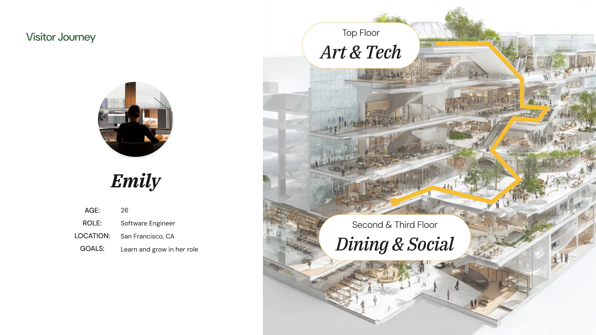 She enters The Living Hub and moves directly to the top-level Art & Tech Zone. Here, she encounters exhibitions, workshops, and the networking event itself, all of them set within a relaxing greenery-filled environment that contrasts with her typical work surroundings.